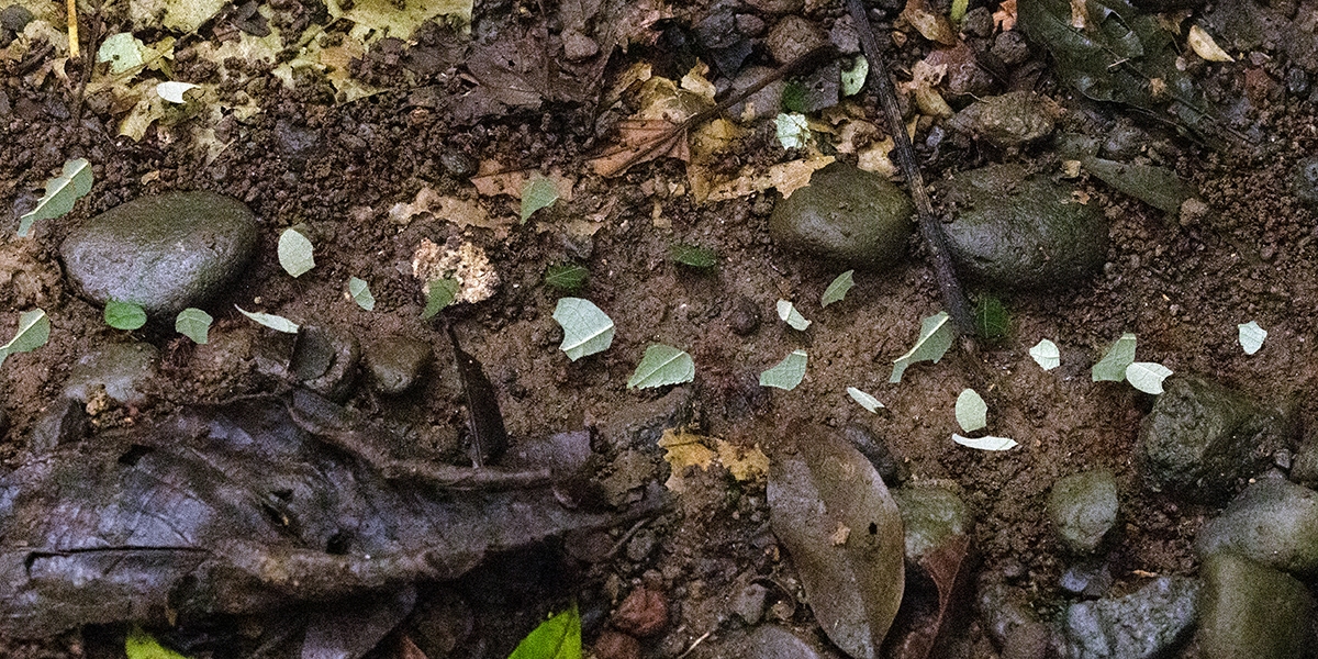 Leaf Cutter Ants [Zompopos] 12/20/2025 Costa Rica Just 2 feet of a line of leaf cutter ants that stretches several kilometers into the jungle. They carry leaf pieces up to 10 times their own weight back to the nest and undergrounds gardens where the leaves are fed to breadlike fungi which they consume. Photo# 5253