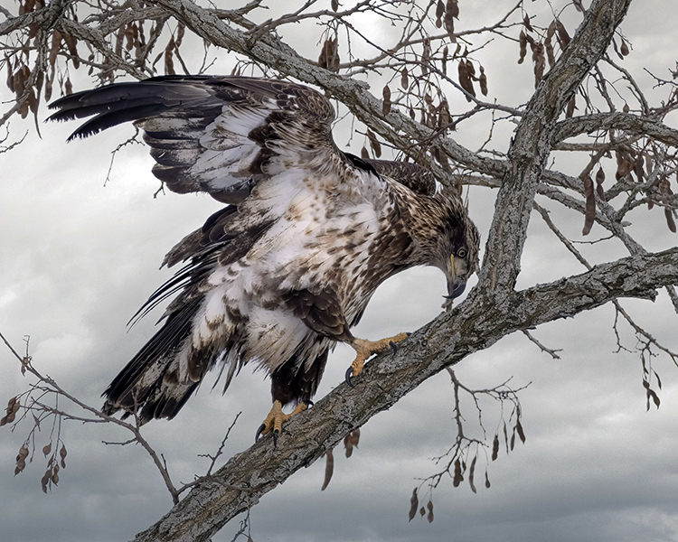 Immature bird with a balancing act in the high branches.