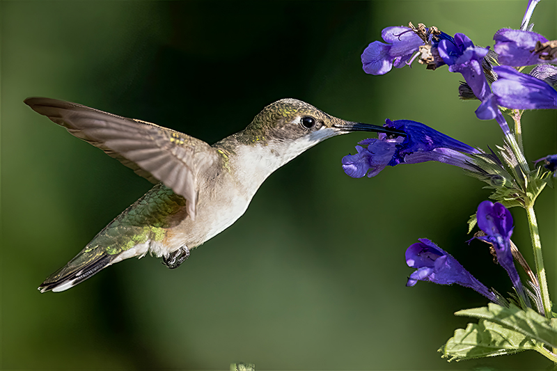 Hovering midair stretch for a sample of nectar from purple nepatha.