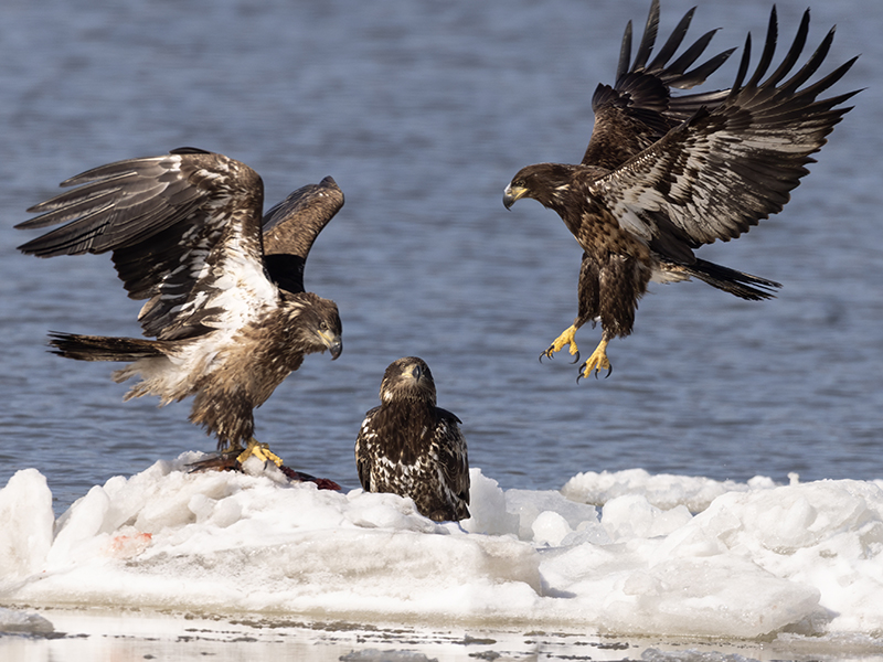 Trio of immature eagles, each with a different view of the fairest way to divide that fish.