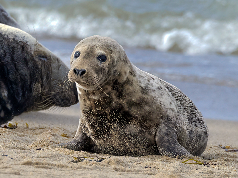 Gray seal pup waddling closer to its mama at low tide.