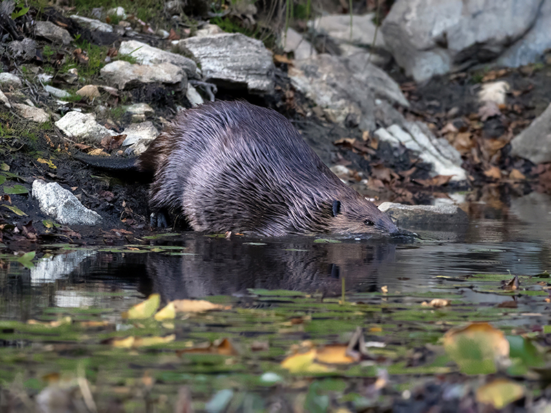 Slip sliding away...yearling beaver silently slips back into the pond.