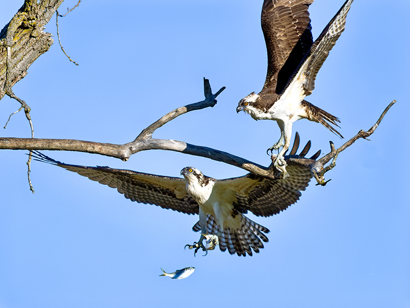 The topmost fish-carrying osprey spooked the bottom osprey into dropping one of two fish it was carrying.