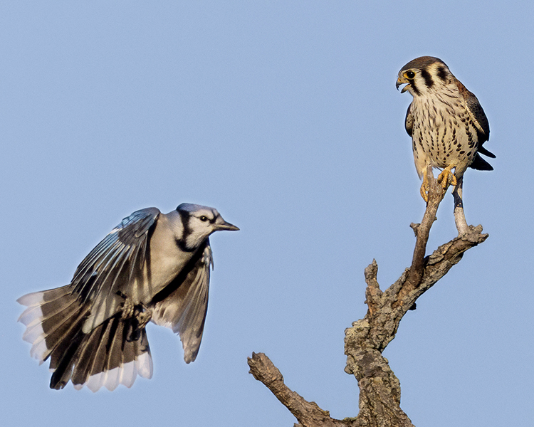 Aggressive bluejay tries to dislodge a male kestrel from its perch.