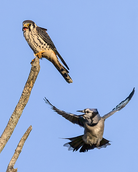 Bluejay strafing a male kestrel.