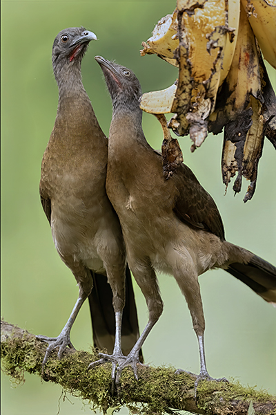 Pair of chachalacas settled next to a hanging bunch of ripe bananas.
