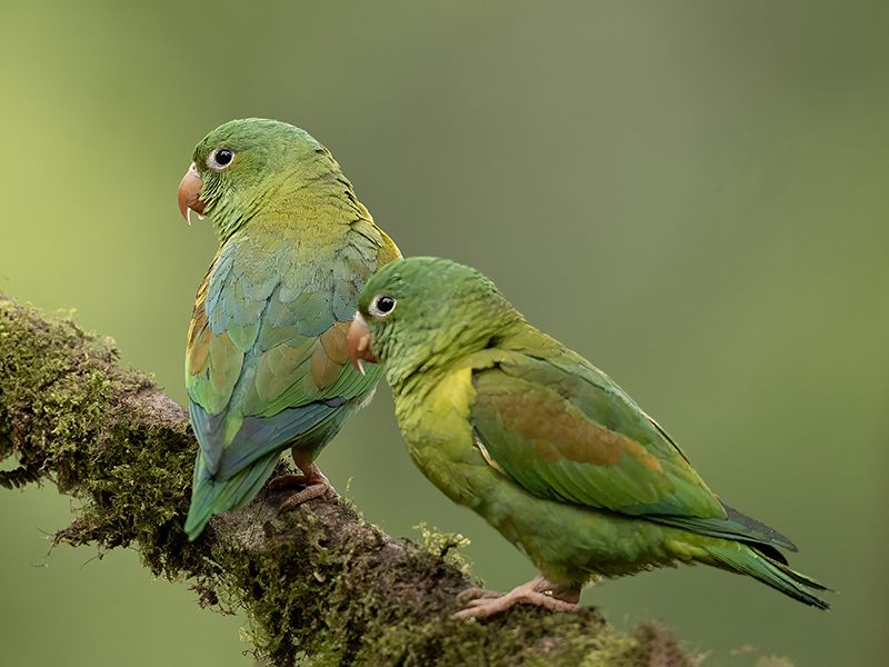 Pair of orange-chinned parakeets at rest on a moss covered branch.