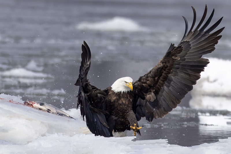 This majestic eagle overshot the landing strip and instead of eating breakfast is about to slide into the drink.