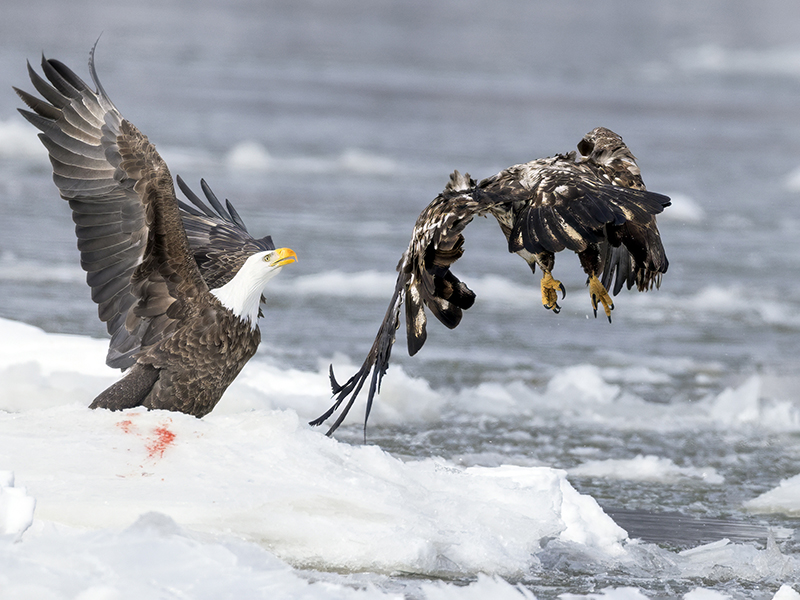 Adult eating a bloodied fish chases away an intrusive immature bird.