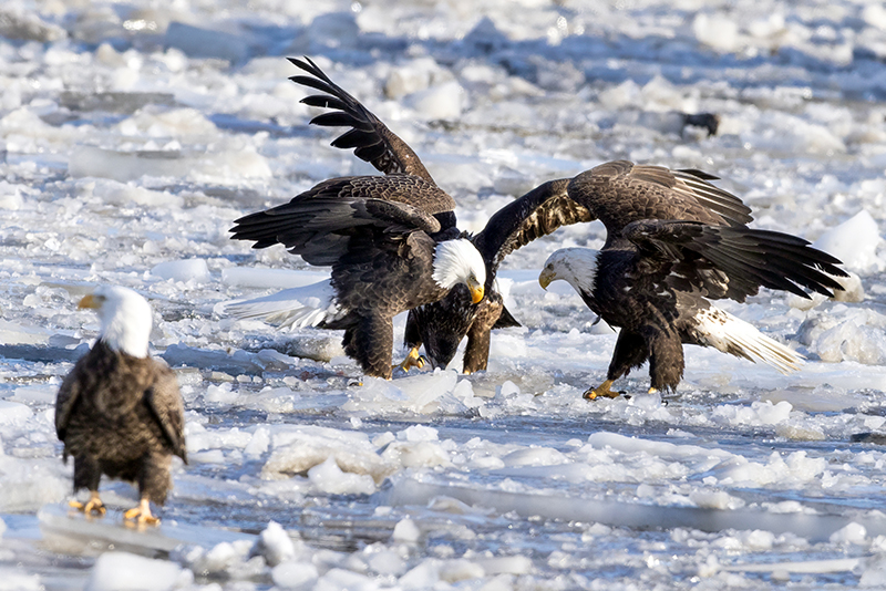 Pair of adult eagles tries to discourage a juvenile intent on eating the fish they'd been sharing.