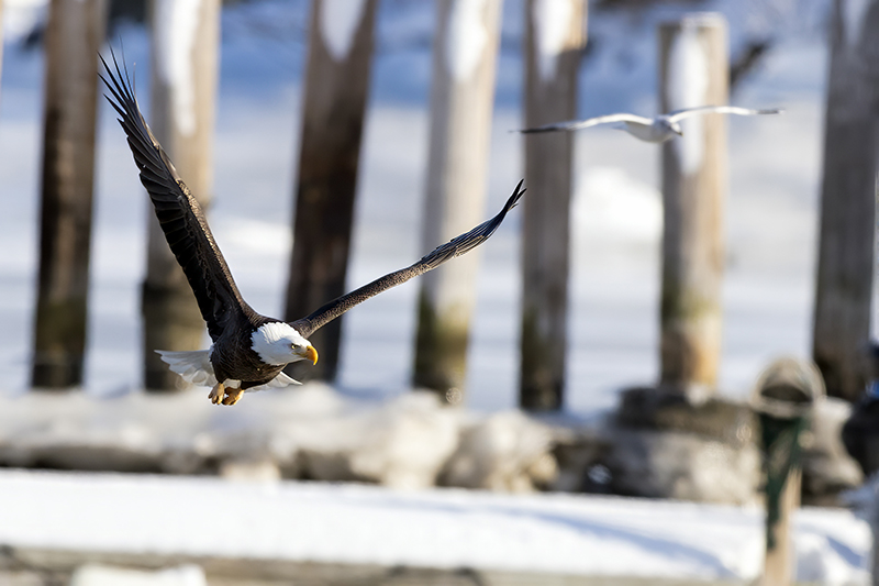 An adult eagle and a seagull race to the spot another eagle just dropped a fish.