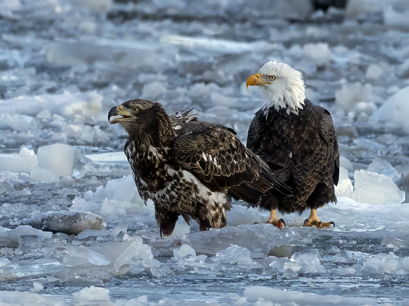 An adult and immature eagle seem to be decideing how they're going to divide up that fish.