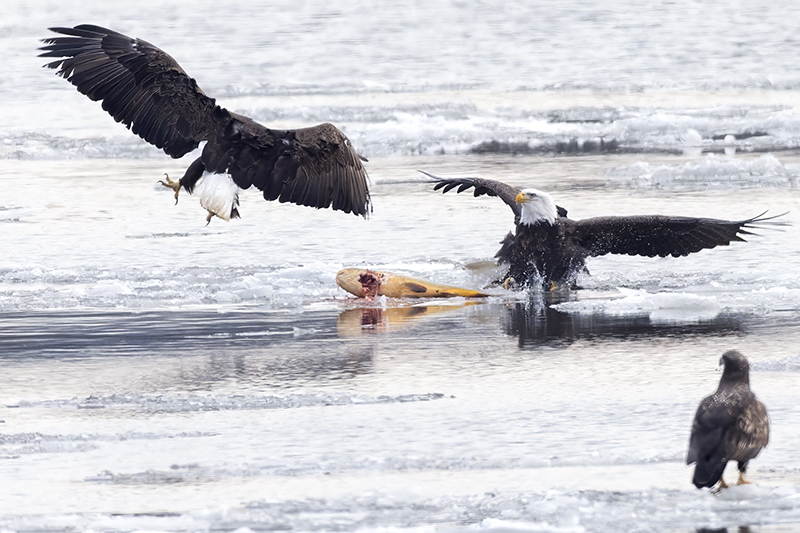 Adult eagle tries to prevent the theft of its jumbo-sized breakfast.