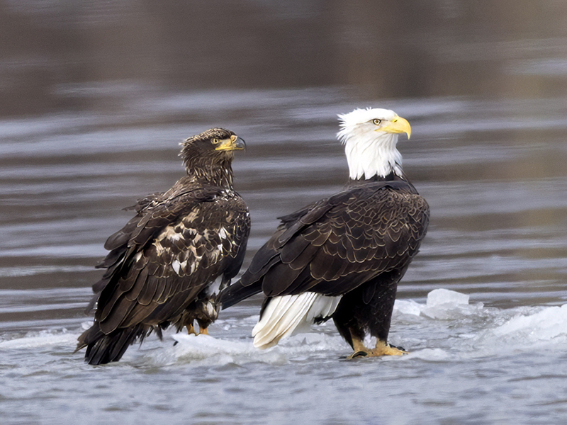 Stark differences in the plumage of an adult and a 1.5 year old bald eagle.