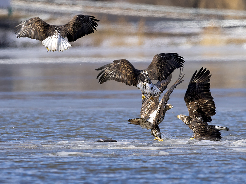 Juvenile eagles landing on a ice raft carrying a dead fish.