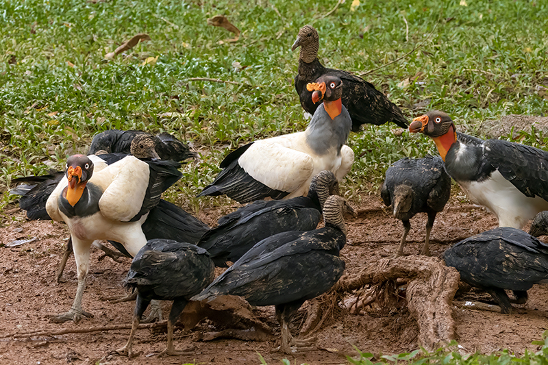 Trio of king vultures join black vultures to feast on a pig carcass.