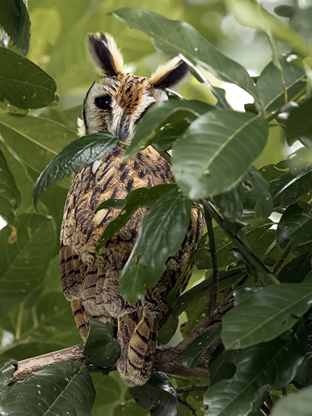 This medium-sized owl has large ear tufts.