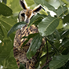 This medium-sized owl has large ear tufts.