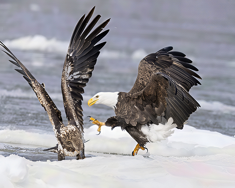 It's payback time as an adult eagle gets ready to stomp on the immature bird who tried to steal his fish.