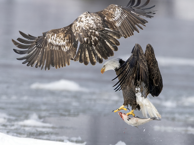 Adult tries to escape so he won't have to share a fish with a pesky immature bird.