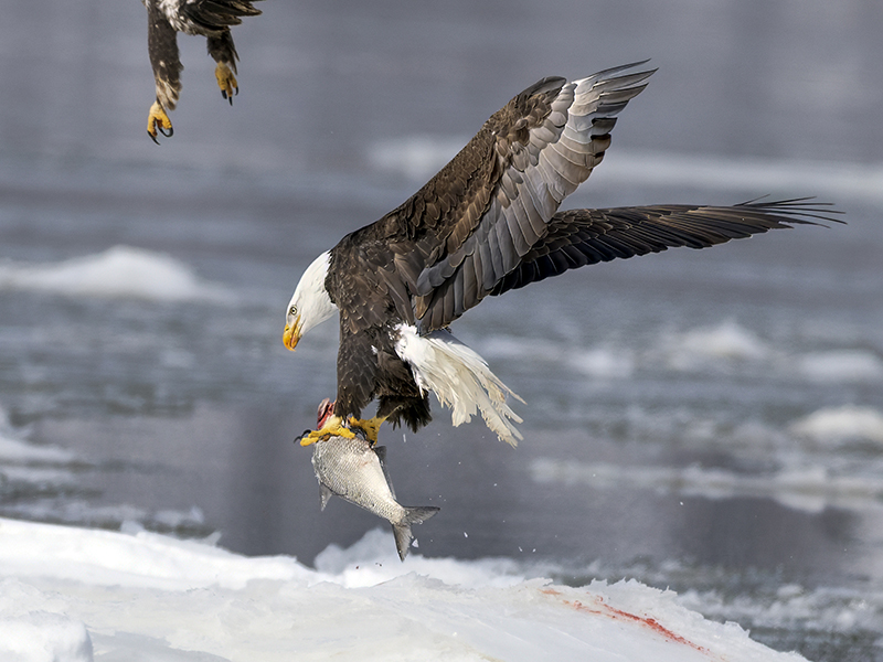 Blood trail left behind on the snow as adult eagle makes an escape with a breakfast he does not want to sharer with an encroaching intruder.