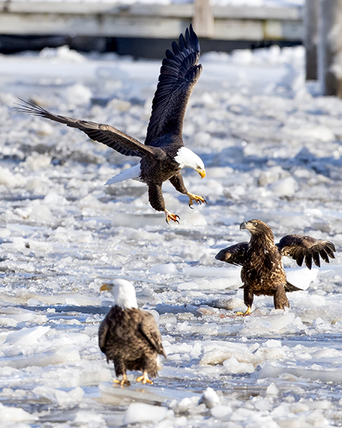 Adult attempts to drive off a stubborn juvenile looking for a bite of a fish.