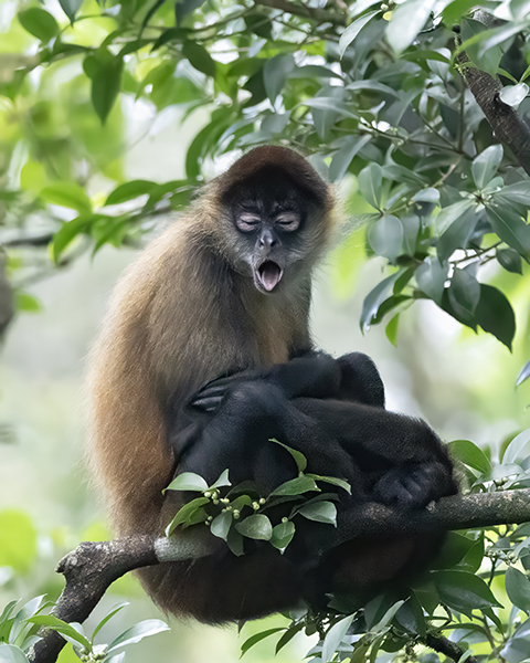 During nighttime these monkeys sleep together in the treetops in large groups.